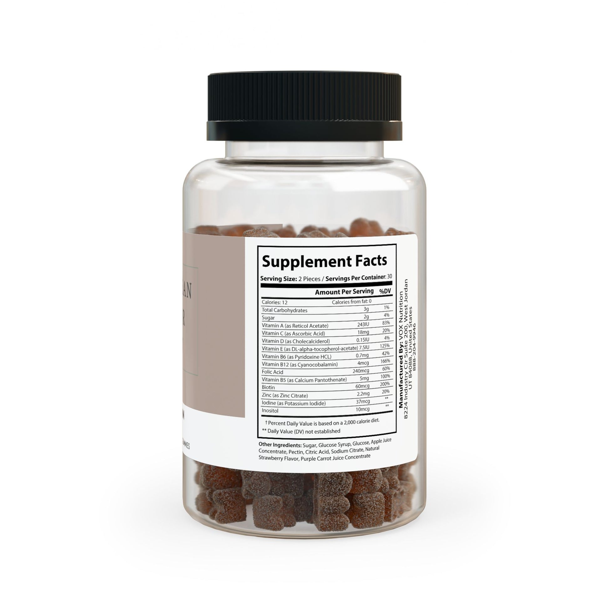 Ingredients: Vitamin A (as Reticol Acetate), Vitamin C (as Ascorbic Acid), Vitamin D (as Cholecalciderol), Vitamin E (as DL-alpha-tocopherol-acetate), Vitamin B6 (as Pyridoxine HCL), Vitamin B12 (as Cyanocobalamin), Folic Acid, Vitamin B5 (as Calcium Pantothenate), Biotin, Zinc (as Zinc Citrate), Iodine (as Potassium Iodide), Inositol. Other Ingredients: Sugar, Glucose Syrup, Glucose, Apple Juice Concentrate, Pectin, Citric Acid, Sodium Citrate, Natural Strawberry Flavor, Purple Carrot Juice Concentrate